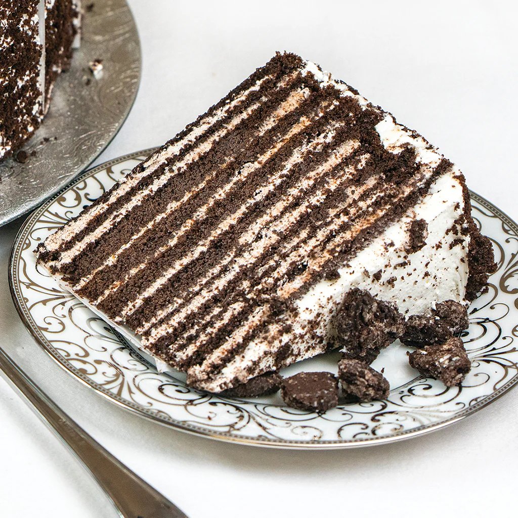 Multiple thin layers of moist cake with rich, fudge-like chocolate frosting.